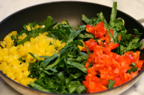 In a small fry pan, put the spinach, 1 teaspoon of water and the diced peppers. Cook on medium high until the water evaporates and the spinach is wilted. The peppers should be just barely warmed through. This shouldn’t take more than 3 or 4 minutes.