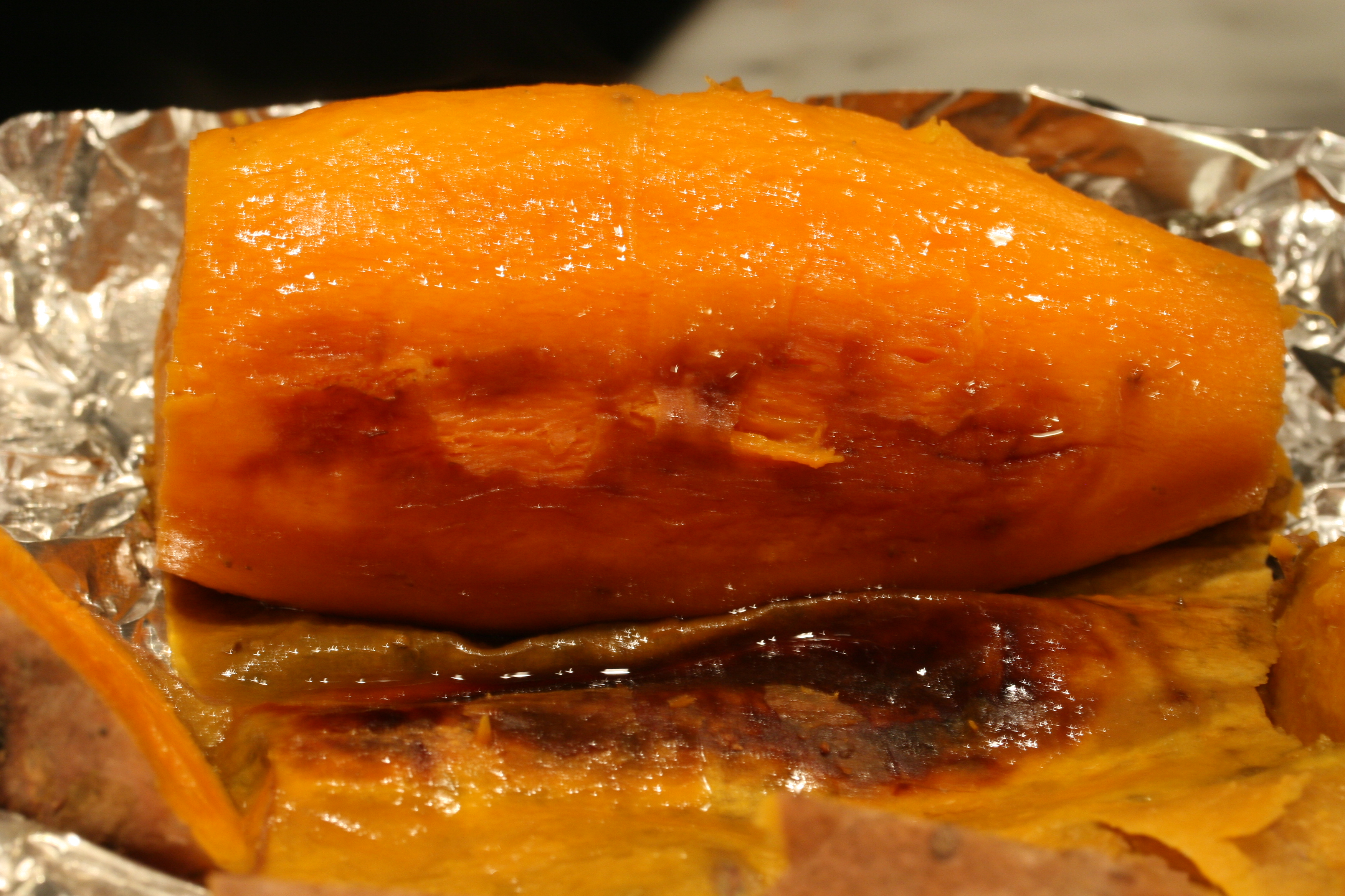 Wash each of the potatoes well, and wrap with heavy-duty aluminum foil. Place on sheet pan and bake in a 350 oven for approx. 50 to 60 minutes. You’ll start to smell them, and then check, using a potholder, press gently on each side. When you feel it yield easily, they’re done. Remove them from the sheet pan and place the banana with the slit side up on the pan and bake in the oven for 15 minutes. The skin should be black and the banana showing some steam and small bubbles through the opening. Remove from oven. Carefully, open the foil on the sweet potatoes and cut off each end, spilt the skin and peel from potatoes. Chop into smaller pieces and put in large bowl or bowl of mixer. When all the potatoes have been added to the bowl, spilt open the banana and starting at the top with a spoon just scoop the whole thing into the bowl. Put the brown sugar and the heavy cream into a measuring cup and microwave for 45 seconds. The sugar should be liquid and the cream will be on top. Just stir it together. Add the rest of the ingredients to the bowl and turn it on low until the potatoes start to break down and everything gets mixed together. Or just mash, mash, mash with your masher. Love that word, masher. Makes your mouth feel funny saying it.
