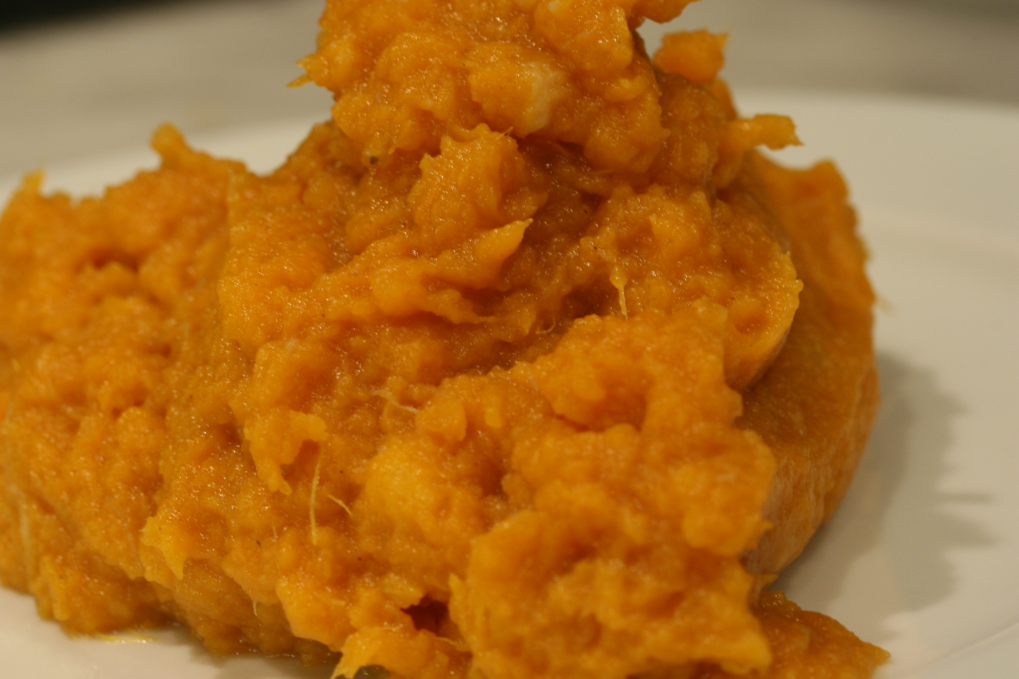 Humble, homey mashed sweet potatoes. Nothing swoon-worthy or earth shaking there. Several people I know, including myself, have banned the canned, syrupy pieces covered in more sugar (of various forms), butter, and encased in either mini or giant nightmare making marshmallows. Stay-puft marshmallow man anyone? While that casserole bubbles and melts, getting gooey and browned, the thought of it makes my teeth ache while shivers start making their way down my body. Waaaaay too sweet! I know it’s traditional on so many tables, but not on mine anymore. Now, don’t get me wrong. I love sweet potatoes. I like them just baked, split open and butter melting into it. I like them pureed and crafted into soup with melted swiss cheese croutons floating on it. I like them mashed. Just like this. This recipe started when I went looking for other sweet potato recipes. I saw several sweet potato and banana casserole things, a couple of mashed with banana but the proportions seemed way off for my taste. Then I stumbled on Adam Perry Lang’s recipe. People were raving about it. Apparently he wouldn’t give the recipe out for many years, nor would he hint as to his secret formula. Then he decided to write a cookbook called Serious Barbecue. It’s a seriously good cookbook that everyone should own. But wonders of all, his sweet potato recipe was included. There was dancing in the streets from what I hear. So I took a look. And there in front of me was a recipe that I could work with. I knew right away that I’d be changing things around but he gave me a basis to work off of. The man is a genius. Thank you APL. Now I have a recipe that people are loving. A recipe that makes people who think they don’t like sweet potatoes go back for second helpings (I’m looking at you, Liv). A recipe that makes people say “I’ve never really liked sweet potatoes, but I like these!”