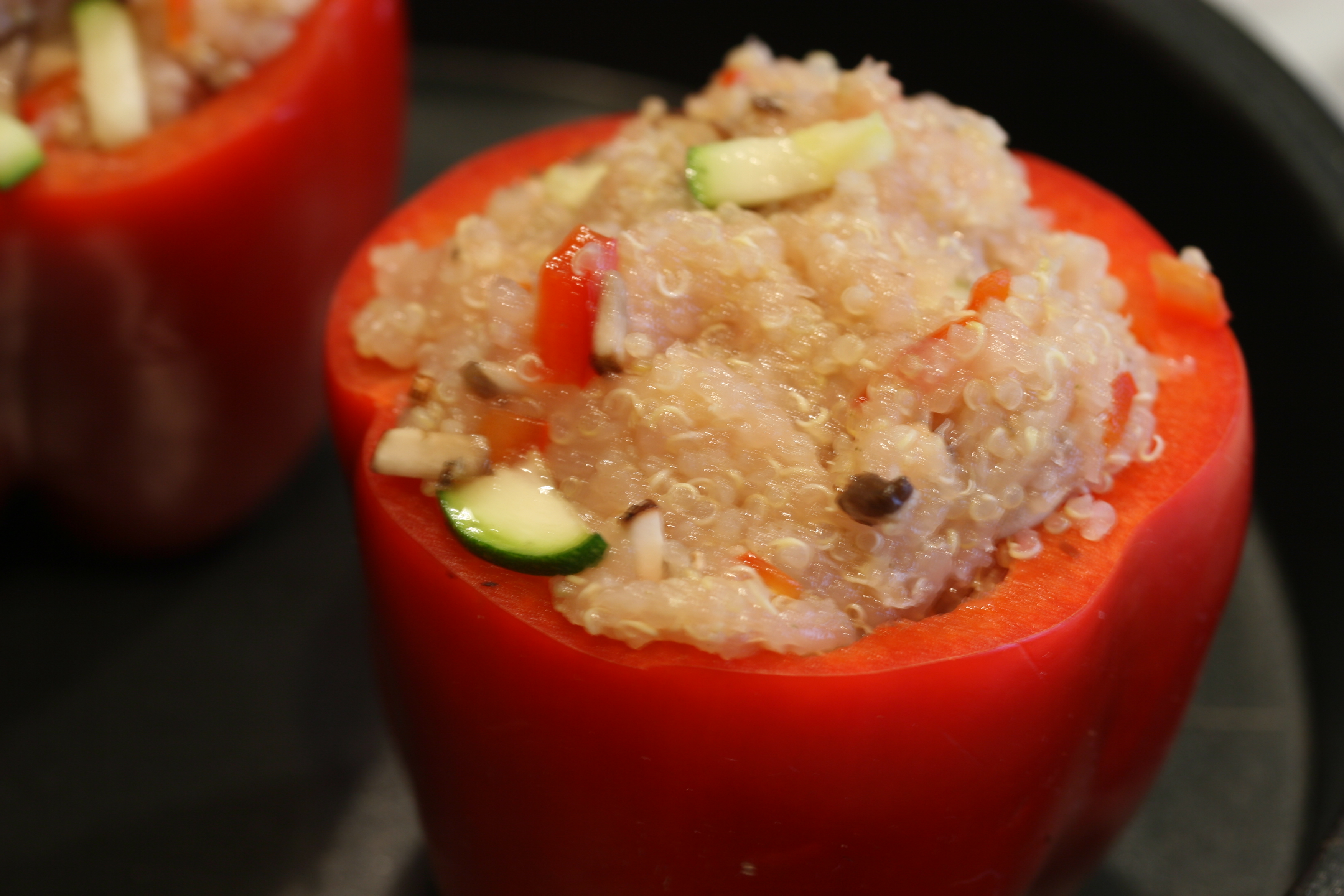 Sometimes, words can elude me. I can stammer, totally lose the next word in the middle of a sentence, and stumble along while hunting for the right words. A title for this post completely stumped me. This is a recipe for Peppers stuffed with Chicken and Quinoa with a Creole Sauce. Lengthy, and frankly, boring. Various arrangements of those words didn’t work, and finally editing it down to just Stuffed Peppers was equally apathetic. I was trying different combos, assorted word substitutions, when I found myself singing “pepper pepper bo bepper, banana fana fo fepper……”. Yikes. Anyhow..