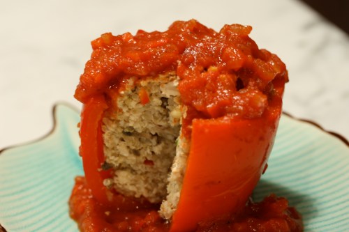 Cut the top 1/2 inch off of 4 red peppers and take out the seeds and pithy ribs. Slice a small bit off of the bottom of the pepper so that it sits solidly and doesn’t wobble. Fill with the chicken mixture, but don’t pack it in tightly.