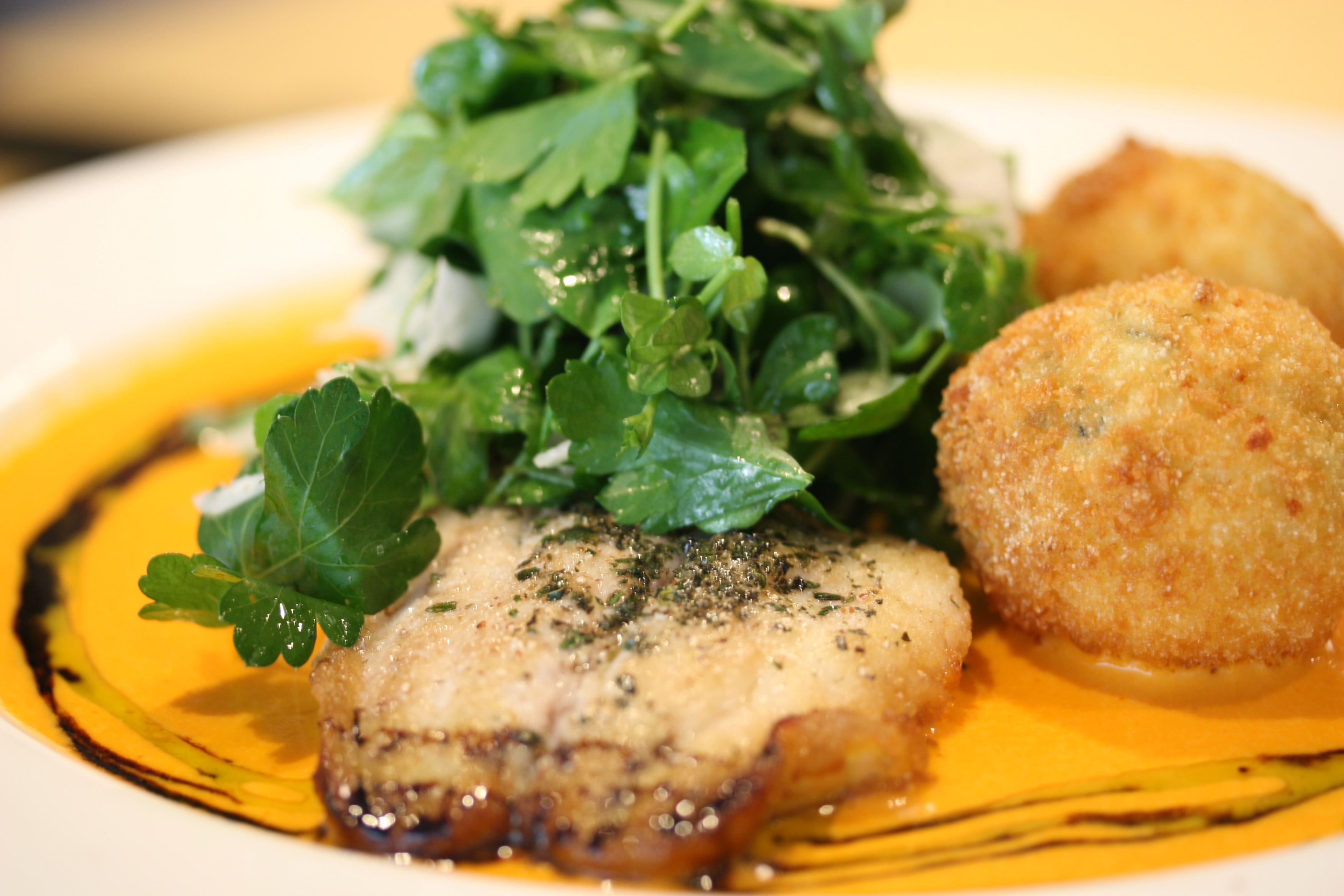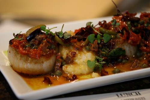 So, can we talk about the dish she made for me? Wow. It was OMG, close your eyes, little moaning noises good. It’s called Capesante. Pan seared sea scallops with polenta and a Mediterranean salumi salsa. Let’s break it down. Seared sea scallops, perfectly cooked, a little brown and crusted on the outside, tender and translucent on the inside. The Mediterranean salsa has a trio of olives, briny capers, sweet sun-dried tomatoes, and crunchy, fried bits of salumi. Grounding all of this is creamy, buttery polenta. It’s then finished with micro greens. There wasn’t one thing you could do to make this better. A perfect dish. Thoughtfully balanced between sweet and acidic, crunchy and soft, with all ingredients shining on their own while harmoniously playing together. I know you’re not supposed to use this word in food writing, but yum. YUM.