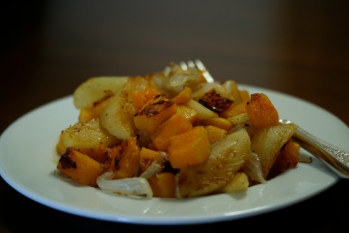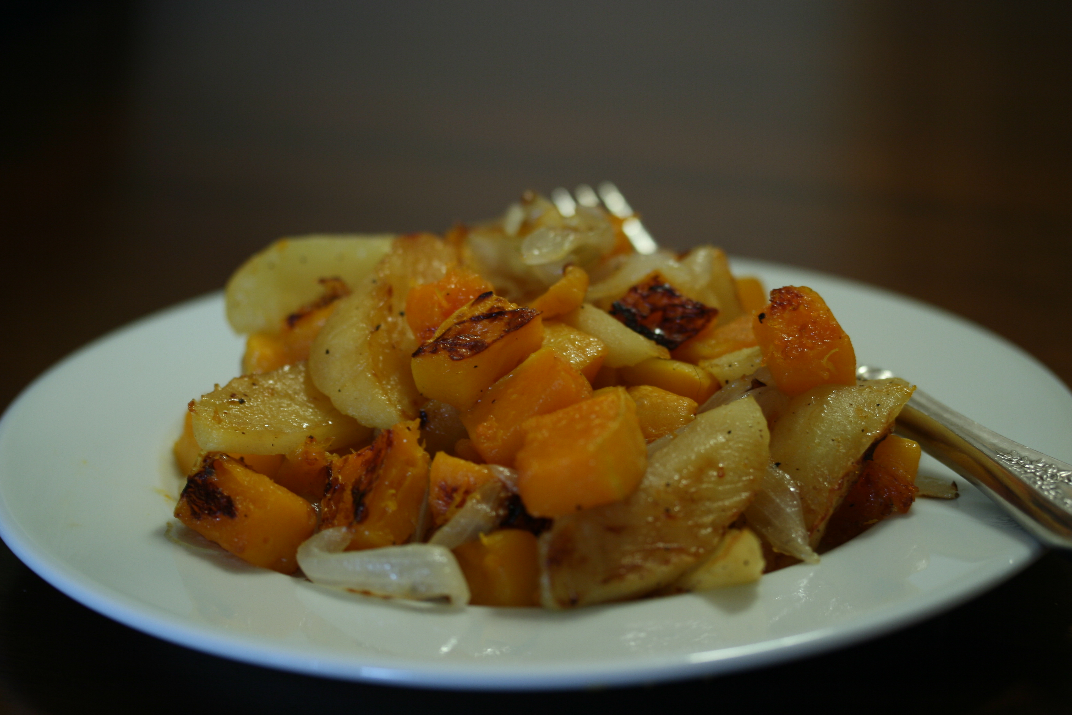 On a large baking sheet, mix squash, apples and onions together. Drizzle olive oil, sprinkle salt and pepper, and mix with clean hands until all are coated with oil and salt and pepper. Place in center of oven and roast for 30 minutes. Check for doneness, the apples should be soft but holding their shape, the squash should be browned and tender and the onions translucent and starting to caramelize. Increase time as needed, checking at 5 to 10 minute intervals. I used a large baking sheet and it took almost 50 minutes. Try not to crowd pieces.